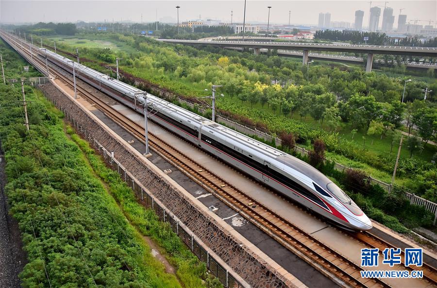 2017年8月21日,从北京南开往天津的C2001次“复兴号”中国标准动车组驶入天津市区。自当日起,铁路部门扩大“复兴号”动车组列车开行范围,京津城际列车开行19.5对“复兴号”动车组列车。新华社发(杨宝森摄)
