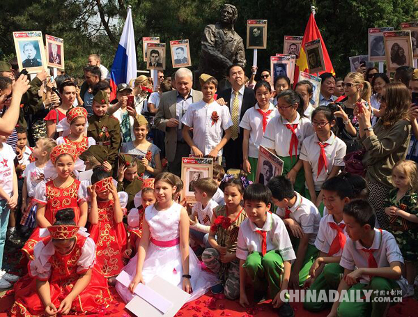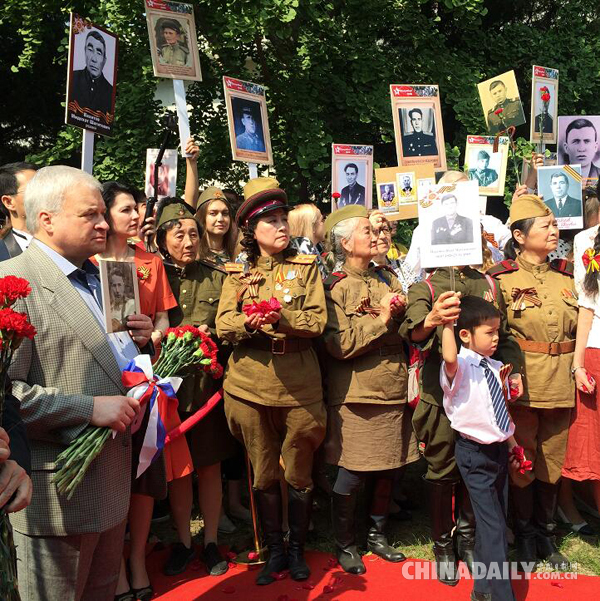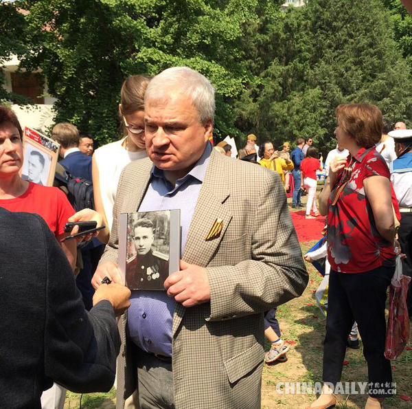 5月9日,俄罗斯驻华大使杰尼索夫带着父亲的照片参加“不朽军团”纪念游行。(摄影:中国日报网记者 严玉洁)