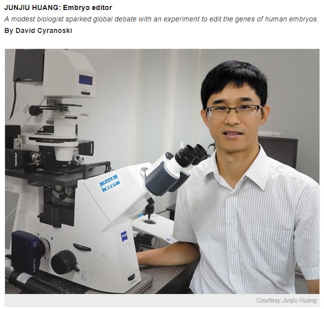 2015年,中山大学教授黄军就上榜,黄军就及其团队利用基因编辑技术对人类胚胎的一个特定基因进行修改,从而避免该基因突变导致地中海贫血症。黄军就在接受《自然》采访时说,这项实验能帮助探讨一些重大疾病在基因层面的成因,并有助于研究胚胎发育过程中基因所发挥的作用。然而,由于这类实验涉及学术伦理,在获得关注的同时也引发争议。例如,尽管黄军就等人使用的是医院丢弃的异常胚胎,其论文发表后仍引发科学界批评。