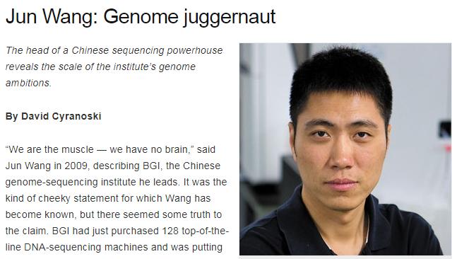 2012年,青年科学家、时任中国华大基因CEO的王俊上榜。《自然》杂志援引哈佛大学遗传学家乔治•洽奇的评价说,1999年,华大基因支持了人类基因组计划的1%,而在2012年,华大的基因测序能力,让其在世界基因测序上的贡献超出了50%。
