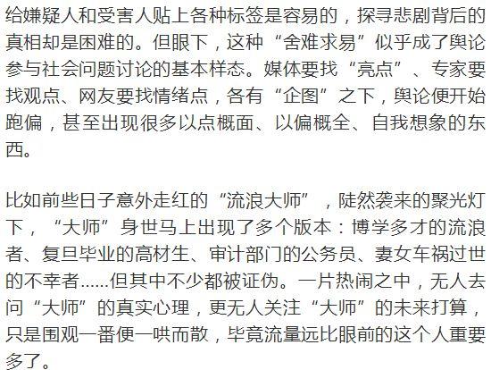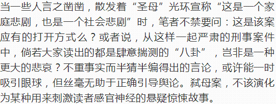 案情真相未明,部分媒体及自媒体已急不可耐蜂拥而上,当起了“名侦探”,煞有介事地推敲起了犯罪嫌疑人的作案动机。有归咎教育的,想当然地把“学霸”犯罪与中国教育强行联系,认为这是学校只重灌输知识而缺人格培养,以致酿成惨剧。有责备家庭的,依托网上的只言片语就脑补出母子之间相处的种种情节,还与新近发生的“男孩跳桥自杀案”勾连起来,称都是因为母亲“控制欲太强”。更有一些则一本正经地以“告诉你真相”为名散布着“八卦”,诸如“幼时父亲出轨”、“和妓女谈恋爱”、“去夜店当男模”等等,让人读来颇为糟心,大有一种“吃人血馒头”的既视感。