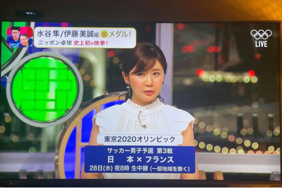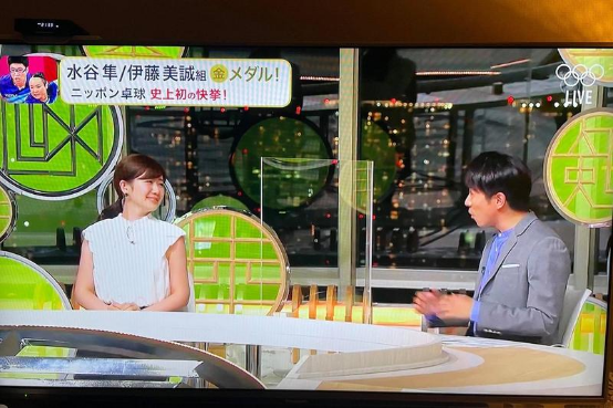 福原爱(左)26日讲解乒乓球男女混双金牌赛。台媒翻摄富士电视台
