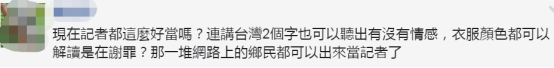 有网友问:“现在记者都这么好当吗?连讲‘台湾’2个字也可以听出有没有情感,衣服颜色都可以解读是在谢罪?那一堆网络上的网民都可以出来当记者了。”↓