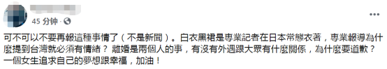 还有网友说,可不可以不要再报这种事情了,白衣黑裙是专业记者在日本的常态衣着,专业报道为什么提到台湾就必须有情绪?离婚是两个人的事,为什么要道歉?↓