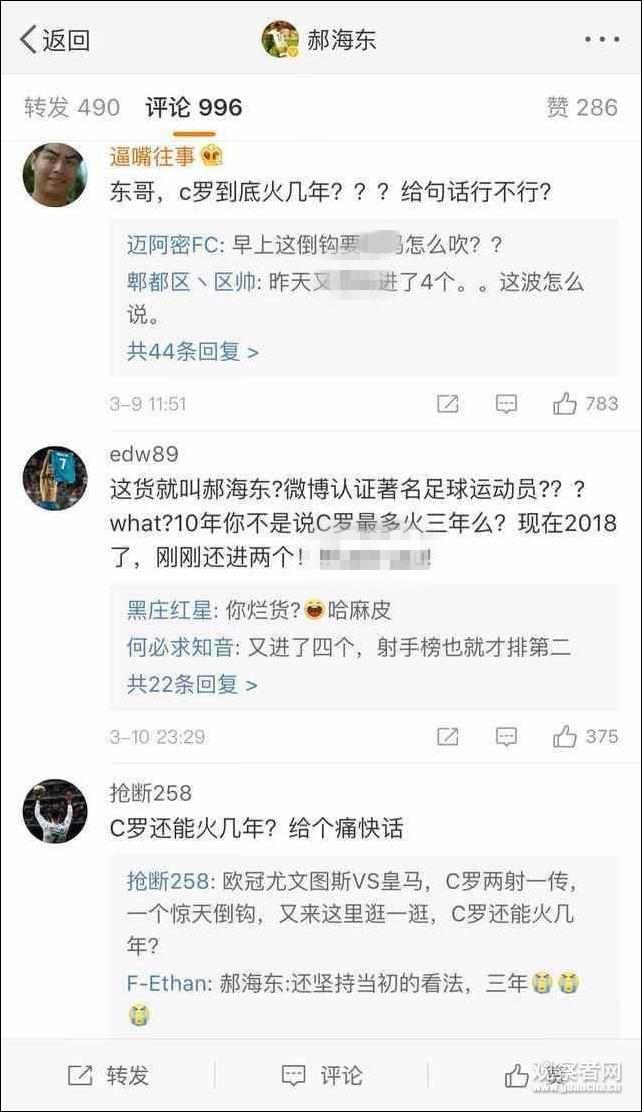 C罗还在今年世界杯第一场对阵西班牙时上演帽子戏法。6月16日那晚,郝海东的微博还被网民“恶言攻陷”。