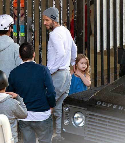 贝克汉姆近日带着爱女小七和爱子们一起逛公园,儿子们在公园玩滑板,贝帅和小七在外面观看,小七一身短裙亮相,已超美,不过跟爸爸哥哥不在一个季节啊。