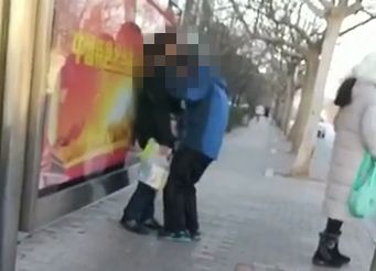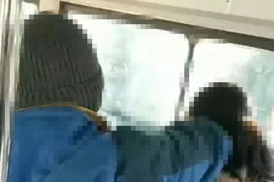 视频显示,年轻黑衣女子靠在车站广告牌上,穿着蓝衣的男子把她胸前的衣服解开,把脸贴在女子胸部亲热。一名带着孩子路过的家长见此情景,连忙拽着孩子快步离开,怕眼前的情景影响到孩子。