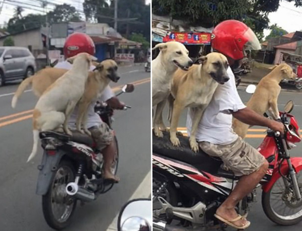 男子载着三只爱犬低速行驶在菲律宾的马路上