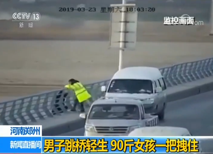 央视网消息: 日前,一名男子在河南郑州黄河桥上欲跳河轻生,危急时刻,一位年轻女子挺身而出,使出全力向上拉拽这名男子,最终,在路过热心群众的合力帮助下,这名男子被救了上来。