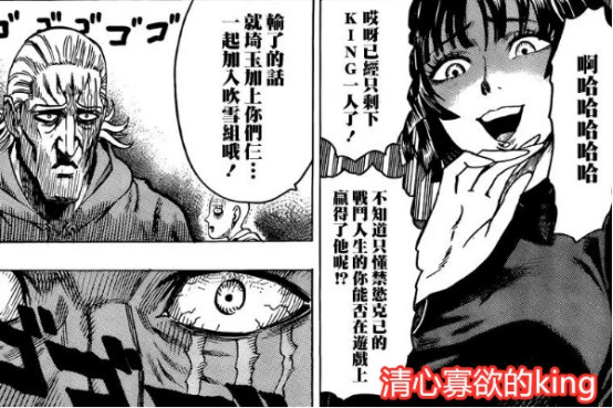 邦古和杰诺斯两人让他们和敌人生死搏斗简单,要他们来打游戏的话,不把按钮捏碎就不错了。所以杰诺斯和邦古刚上场就败下阵来,而埼玉的话,从他多次被KING丝血反杀来看,就知道他是个白给的。在埼玉也输了以后,吹雪已经觉得自己胜券在握了,剩下一个清心寡欲的KING又怎么可能打败整个吹雪组呢?