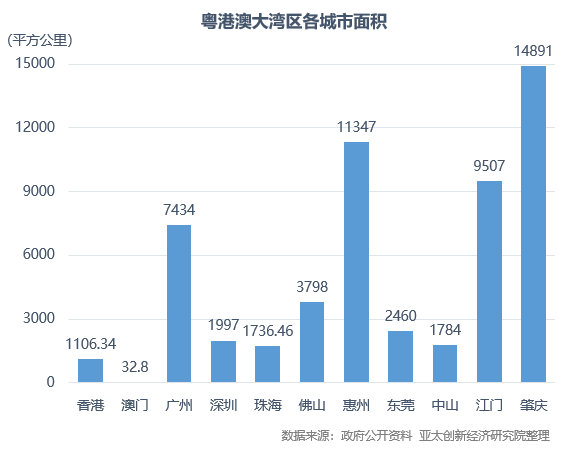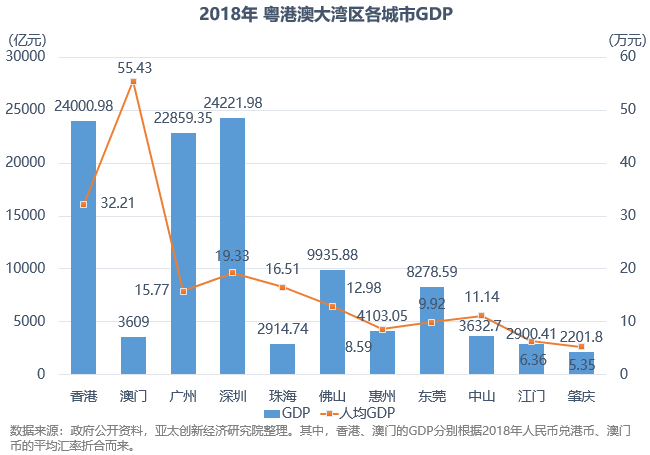 从人均GDP来看,粤港澳大湾区所涵盖的11个城市中,9个地区的人均GDP超过了全国平均水平5.92万元。澳门因人口规模最小使得人均GDP远超其他城市。