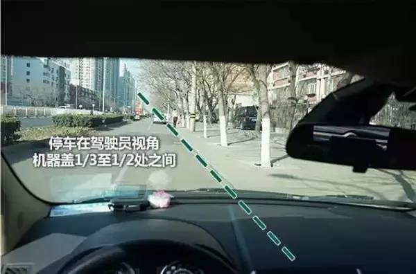 走访多位老司机,他们多年摸索出的靠边停车经验,第一步就是看路边石与机器盖的重合位置。如果此时路边石的延伸线在前机器盖的1/3到1/2范围之间,就大约OK了。