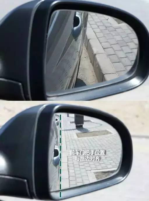 向右侧调整车身,直到我们能从右侧后视镜中看到,右侧前门把手能够遮住路边石边缘。一旦重合,要迅速打正方向盘调正车身。多试几遍就OK。
