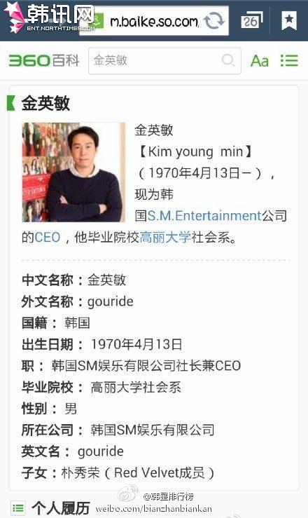 有细心的网友发现,金英敏的360百科词条下,子女一栏填写的是朴秀荣,就是SM新女团RedVelvet成员。朴秀荣Joy,是团内的忙内、副rapper,出道时以绿色头发为代表形象,甚是清新可爱。