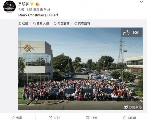 12月25日,远在美国的贾跃亭在微博上晒出FF全体成员合影,并祝福网友圣诞快乐。而在两天前,盛大文学原CEO、火星小说创始人侯小强今天曝料称,他在洛杉矶试驾了FF91,并见到了贾跃亭及其妻子甘薇。