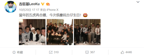 10月20日,古天乐生日,古巨基晒图纪念五虎重聚:当年的五虎再合体,今次系庆祝古仔生日。解散这么久,20多年带着青春记忆的老友相聚,难怪古巨基会如此激动。