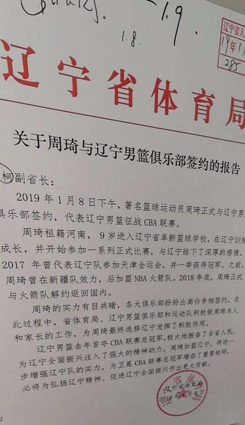 网传体育局官方文件1月份周琦与辽篮或已签约