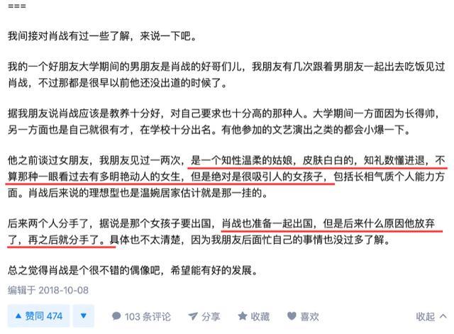 肖战的大学同学还爆料说女生也很优秀,是个知性温柔大方的姑娘,白皮肤耐看,气质也非常好。肖战能喜欢上的人,肯定是有能够打动他的闪光点。不过,在他们分手之前,肖战也曾经为爱情努力过,积极准备和对方一起出国,但后面也许是有其他事情耽误了,使得两人和平分手。
