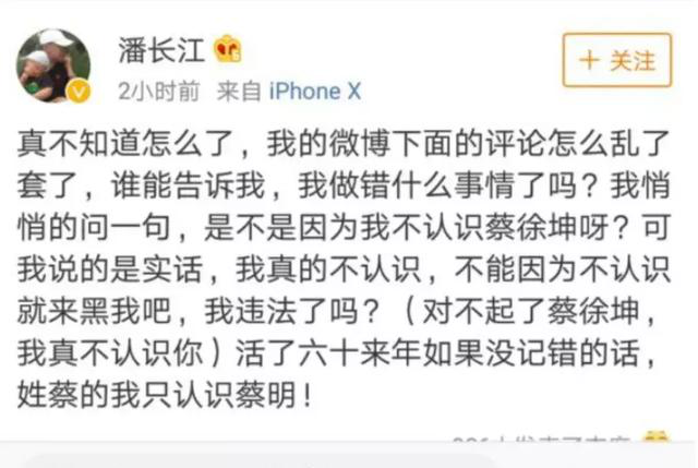 闻名小品演员潘长江教员在某综艺节目中说不了解蔡徐乾是谁,这件事一出粉丝当即霸占了潘教员的微博,发一些欠好的谈吐来打击潘教员,对此潘长江教员发微博称不得不了解蔡徐乾就黑我吧,姓蔡的只了解蔡明。Via联谊新闻网-传递不一样的新闻资讯